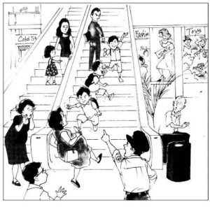 A boy named Rahul was in the Mall. He liked escalator very much. He was also a naughty boy. He was playing on the escalator in the mall. His parents were telling to him that he should not do that. Suddenly, he got stuck and fell on a woman and got hurt in his leg. From that day onwards, he stopped being naughty.